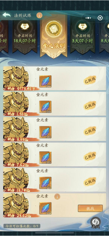 法则获取途径与常规资源不同,在悟道活动结束后,试炼关卡成为唯一产出源。试炼体系按五行属性划分,其运作模式与仙友切磋相似。当角色突破至大乘期可解锁三重试炼层级,随着修为晋升至真仙境、天仙境还将逐步开放高阶挑战。成功镇压试炼守卫后,修士可获得珍贵悟道石,每日还可对已通关的最高层级进行快速扫荡。