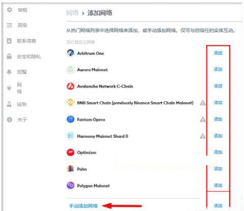 点击网络管理页面底部的「添加网络」选项,系统将展示内置的智能链列表。新版本已集成主流公链配置信息,用户可直接在推荐列表中找到币安智能链选项。