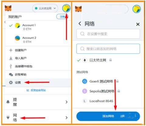 启动 Mask客户端后,依次点击界面右上角个人标识图标,进入系统设置菜单选择网络管理模块。在区块链网络列表中可查看当前已配置的主链信息。