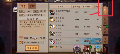 2、进入阴阳寮界面后,注意右侧功能导航栏。顶部首个信息面板按钮即为寮数据看板,此处会显示成员列表与功勋统计,点击该按钮进入次级菜单。