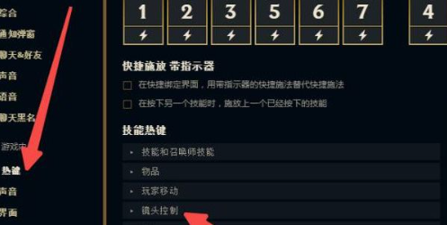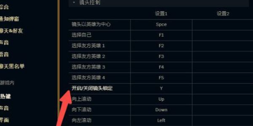 2、进入设置界面后,左侧功能导航栏选择"热键"分类。右侧参数面板滑动至"镜头控制"模块,此处可看到"开启/关闭镜头锁定"的默认快捷键配置。系统初始设定为Y键触发,该功能键位可根据个人操作习惯自由变更。