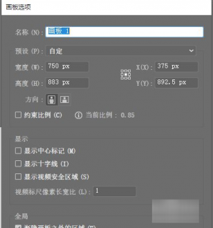 在顶部控制栏的数值输入框内,可直接输入精确尺寸数值进行微调。X/Y轴坐标值用于定位画板原点,宽度与高度建议采用毫米或像素单位。通过画板选项下拉菜单可快速选择预设尺寸规格,勾选"显示中心标记"选项可在画板中央生成十字参考线,便于元素居中对齐操作。
