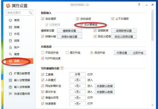 2、在参数配置界面中定位「高级」分类标签,该区域集中管理核心智能功能模块。仔细浏览「智能输入」分组,取消勾选「启用云计算候选」复选框;