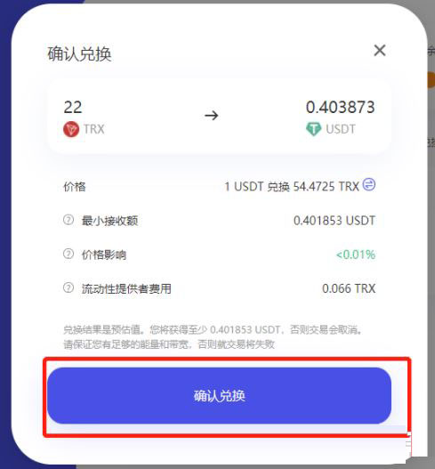 2. 交易信息二次核验:弹出窗口中会完整显示兑换比例、预估矿工费及到账数量等重要参数。建议在此阶段仔细核对钱包地址与网络状态,确认无误后点击交易确认选项。