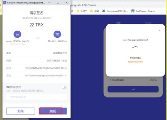 3. 钱包授权验证流程:此时波场官方钱包TronLink将弹出数字签名请求,用户需在移动端或浏览器插件端进行生物识别验证或密码输入,通过安全认证后点击授权通过按钮。