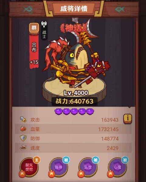 吕布作为核心输出,其「魔神降世」技能在生命值低于50%时可激活攻击力240%加成的狂暴状态,配合「方天画戟」被动提供的暴击率提升,能有效突破BOSS防御阈值。